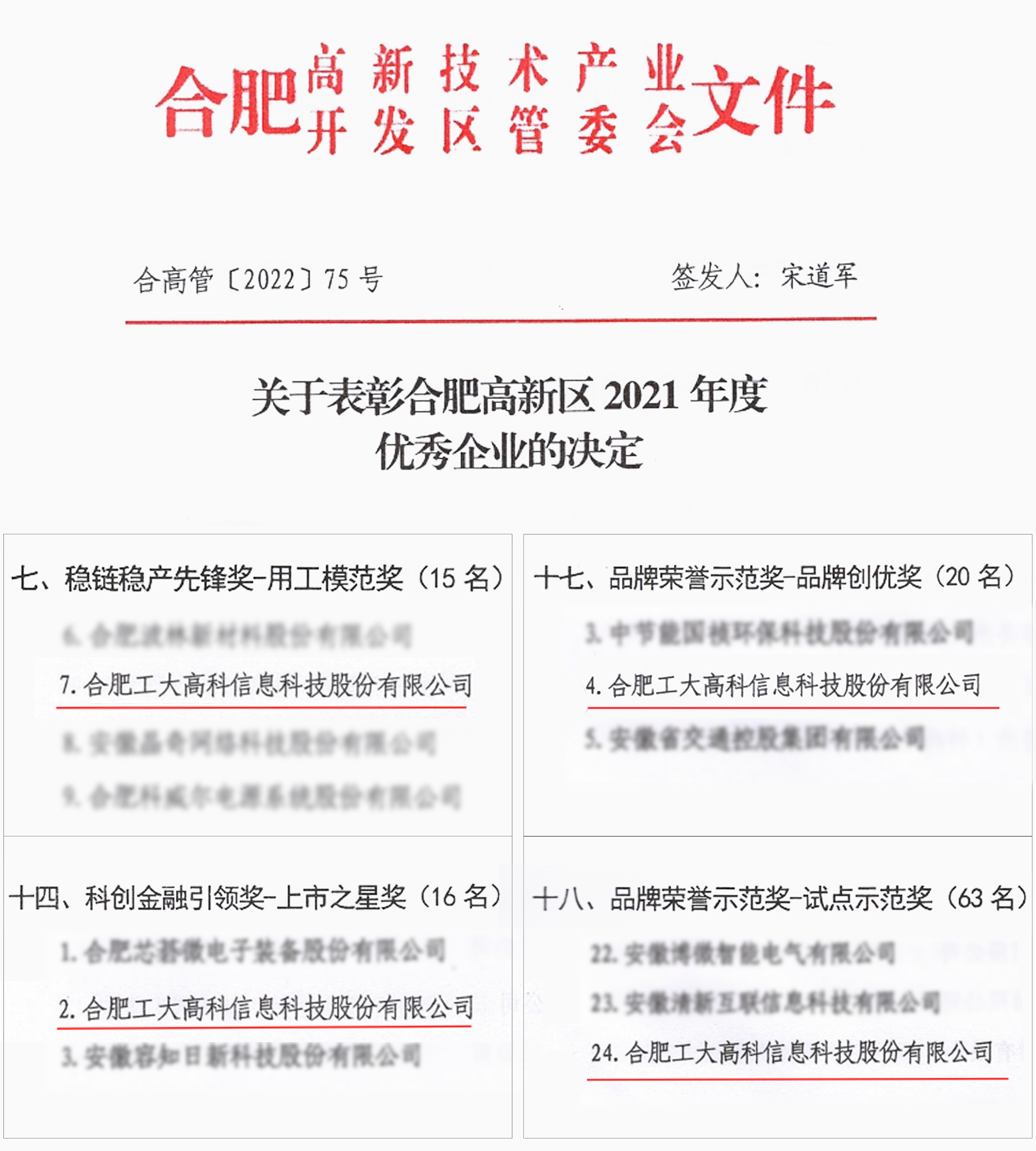 6月10日下午,合肥高新区举办2022年企业表彰大会,对过去一年为高新区经济发展作出突出贡献的优秀企业和个人进行表彰。工大乐鱼荣获“科创金融引领奖-上市之星奖,品牌荣誉示范奖-品牌创优奖,品牌荣誉示范奖-试点示范奖,稳链稳产先锋奖-用工模范奖”四项大奖。
